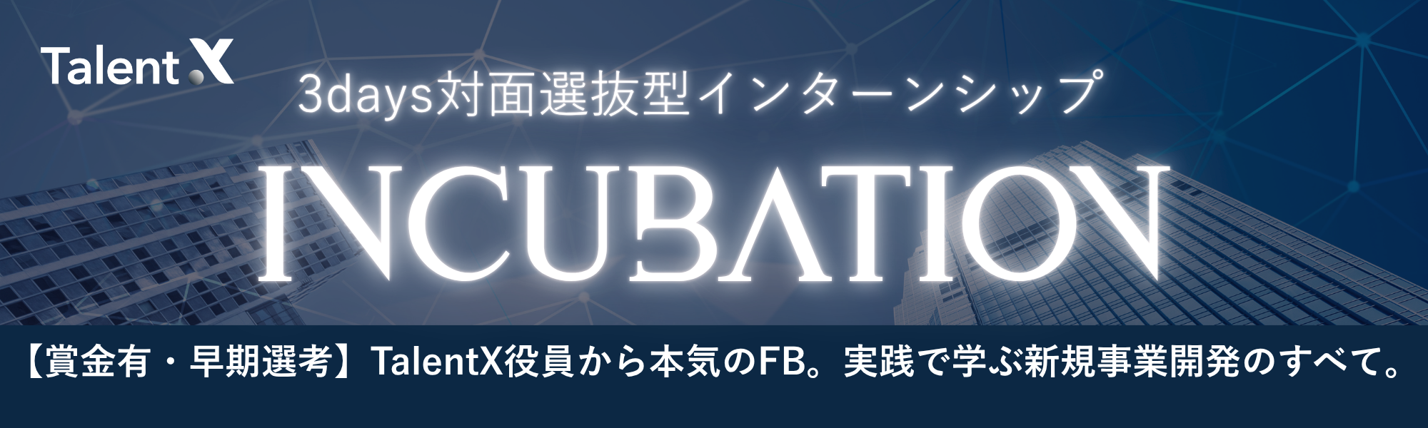 *— 社会を変えるインパクトを創造したいと願う、挑戦者へ。* TalentXが、次世代の事業開発人材を本気で選抜する3 Daysインターンシップ「incubation」を開催します。 これは、ただのビジネスコンテストではありません。
